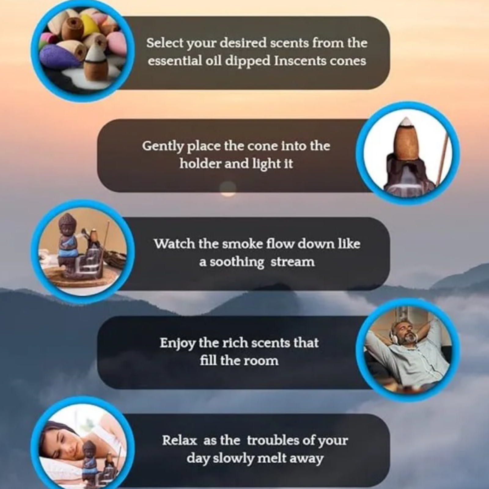 Transform your space with our Backflow Incense Diffuser, designed to purify the air and promote calmness. With 10 essential scents to choose from, this beautifully crafted diffuser creates a serene atmosphere perfect for meditation, relaxation, or unwinding after a busy day.